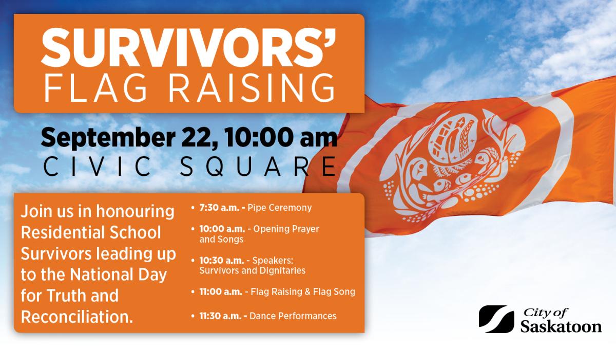 Join us as we raise the Survivors’ Flag. The Flag is an expression of remembrance, meant to honour Residential School Survivors and all the lives and communities impacted by the residential school system in Canada. There will be speakers, both survivors and dignitaries chosen by the survivors.