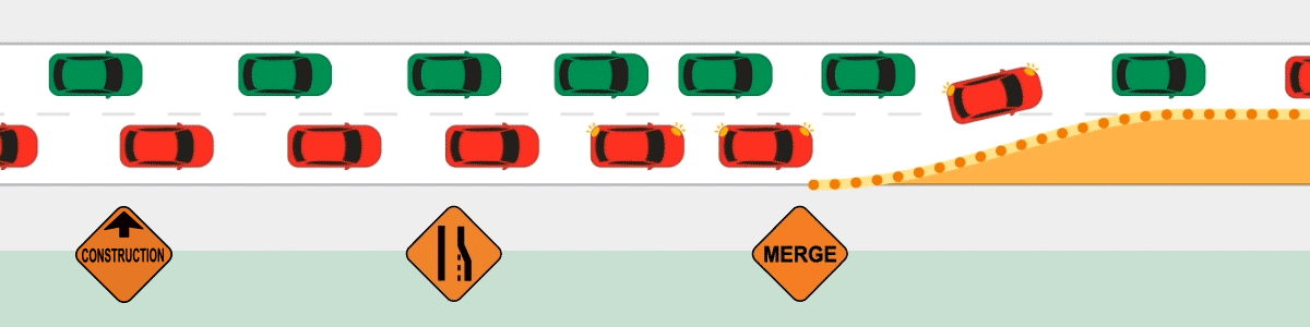When most drivers see the first sign of construction, they quickly move to the lane that will continue through the construction area. This is appropriate when traffic is very light; however, in high-traffic/high-speed areas, this driving behavior can lead to unexpected and dangerous lane switching, serious crashes and road rage.