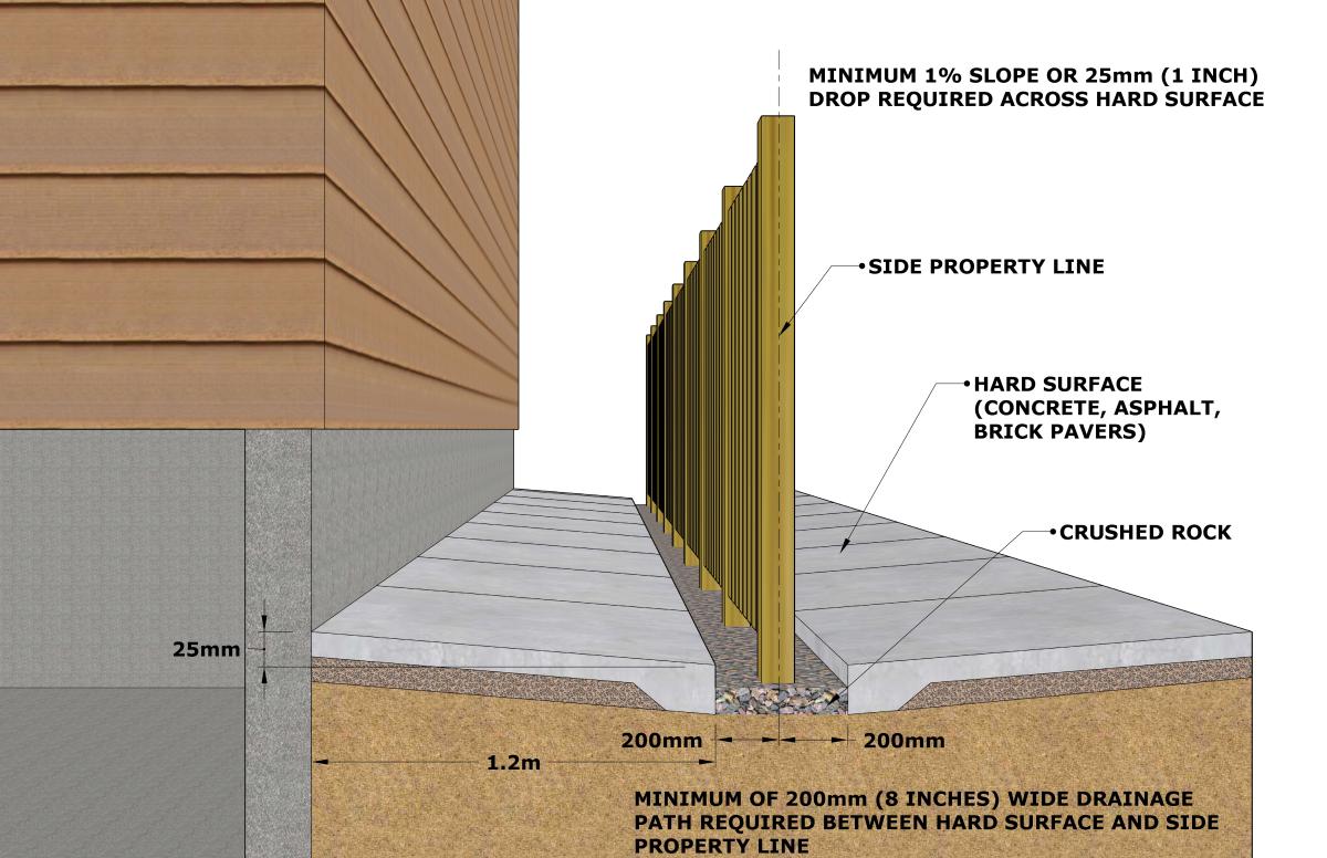 - For hard surfaced areas with less than 3m (10ft) between foundation and property line (side yards), a minimum drop of 2.5 cm (1 inch) is recommended