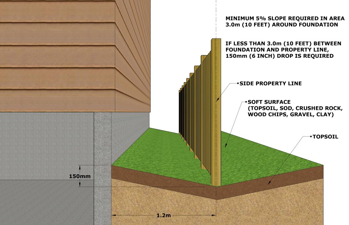 - For soft surfaced areas with less than 3m (10ft) between foundation and property line (side yards), a minimum drop of 15 cm (6 inches) is recommended