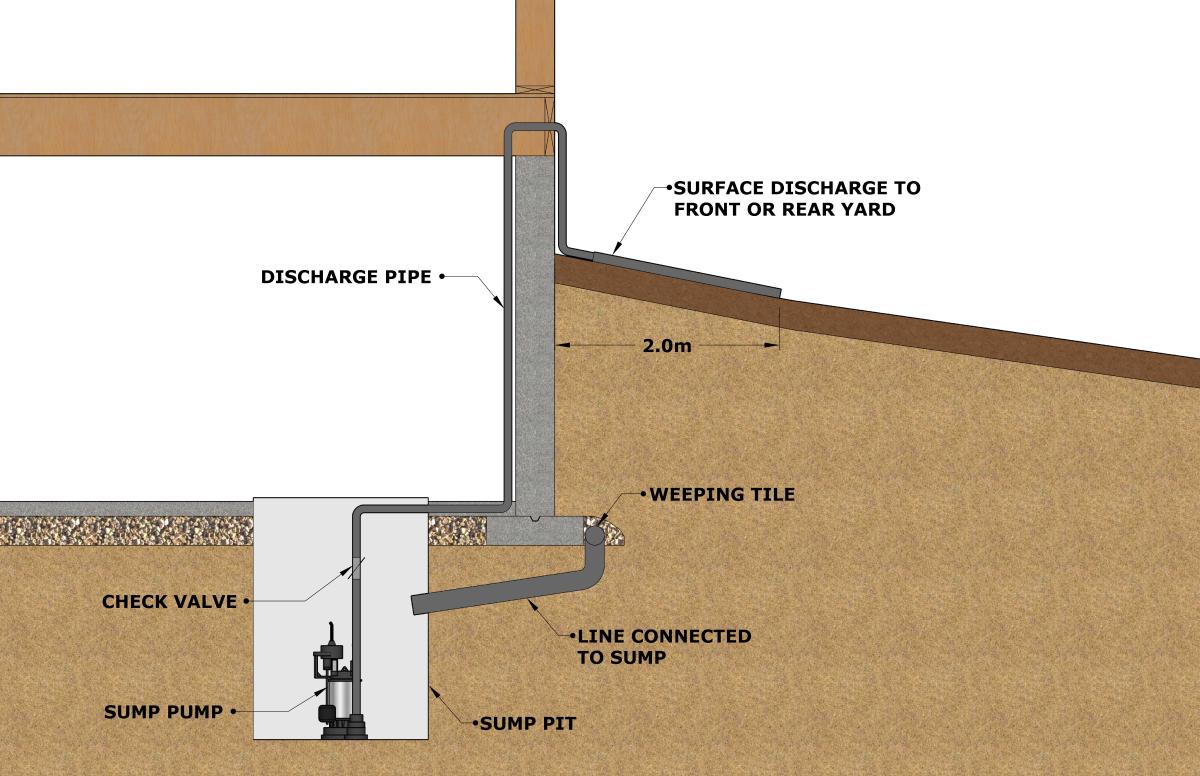 Sump pumps are required to discharge to an area that will not adversely affect a neighbouring property or right of way. When planning sump discharge locations and direction of discharge, consideration must be given to the drainage style of the lot. For example, it is recommended to discharge in front of the home when the lot drainage style is back to front (Type A). It is recommended that homebuilders and homeowners consult with their neighbours to determine discharge locations and the direction of discharge to help avoid adverse impacts to their property or their neighbour’s property.