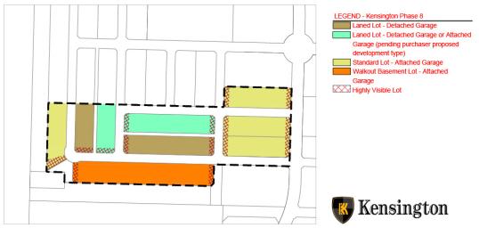 Phase 8 of Kensington features four lot types: Laned Lot - Detached Garage, Laned Lot - Attached Garage, Standard Lot - Attached Garage and Walk-out Basement Lot.