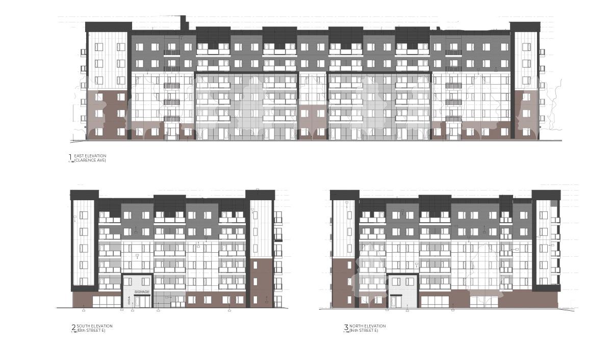 The subject land includes 402, 404, 406, 408, 410, 414, 416, 418, and 420 Clarence Avenue S, between 13th Street E and 14th Street E. The sites are currently zoned RM3 – Medium Density Multiple-Unit Dwelling District and contain one-unit dwellings. Current zoning permissions provide for a multiple-unit dwelling with a maximum height of four storeys / 15 metres.