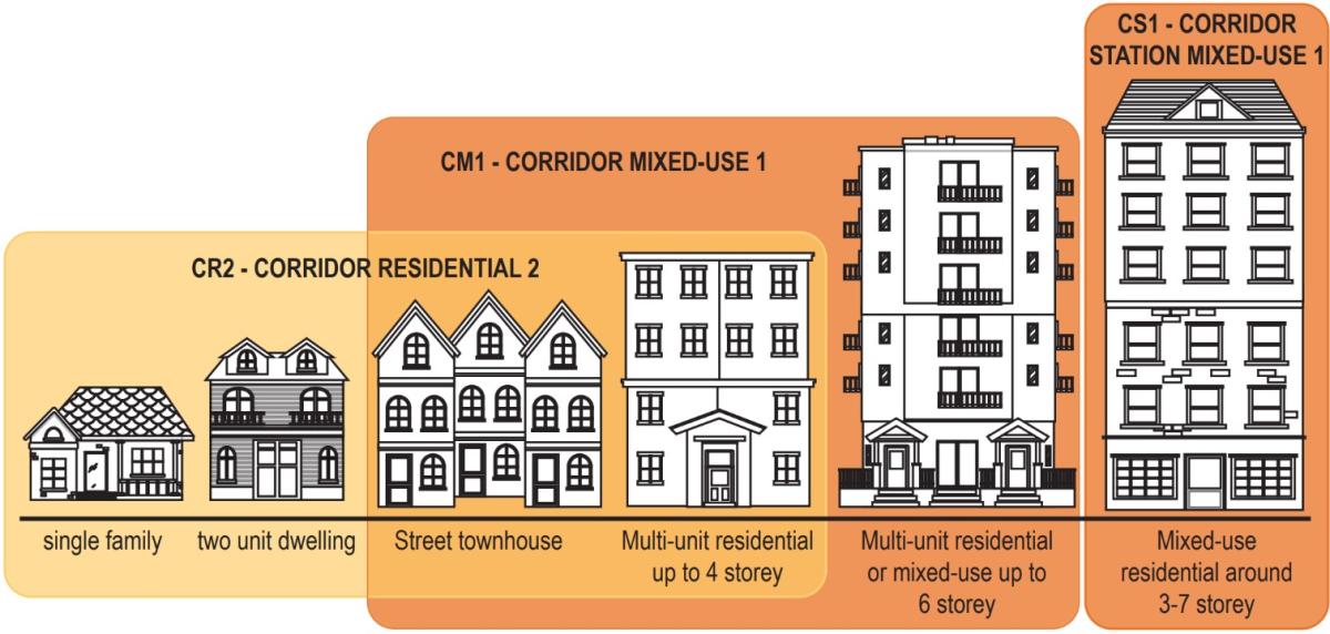 The following graphic illustrates the built forms that are permitted in the Corridor Zoning Districts, including the proposed Corridor Residential 2 District.