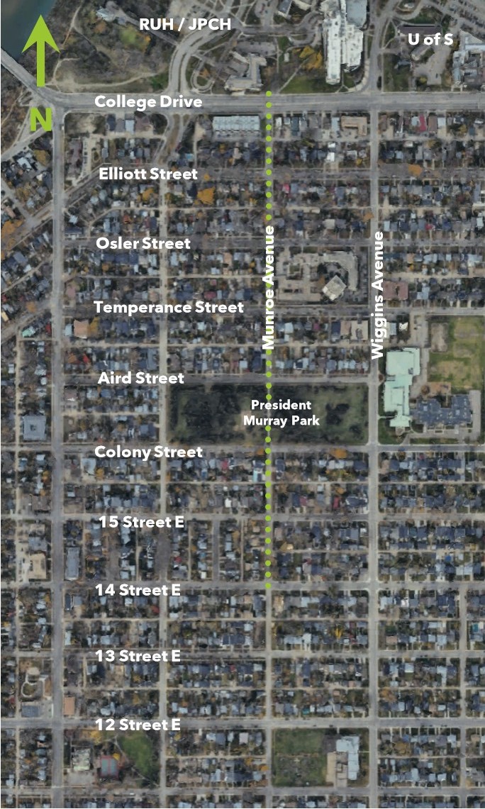 The City of Saskatoon is committed to developing a complete and connected network of walking and cycling facilities for people of all ages and abilities. To support this commitment, the City is implementing the rapid deployment of an All Ages and Abilities (AAA) neighbourhood bikeway on Munroe Avenue between College Drive and 14th Street (see map below) to improve cycling connections to the University of Saskatchewan Campus.