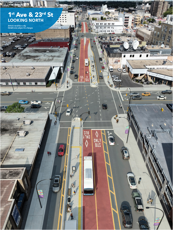 The design of the system along 1st Avenue, one of two areas where dedicated lanes for the buses will be used (the other is College Drive), has been updated to best meet the needs of transit users, drivers, pedestrians and other users of active transportation. These design tweaks were made not only for system efficiencies but to improve safety and accessibility for all. They are the result of years of working with stakeholders and the public all the way back to the original Growth Plan in 2016.