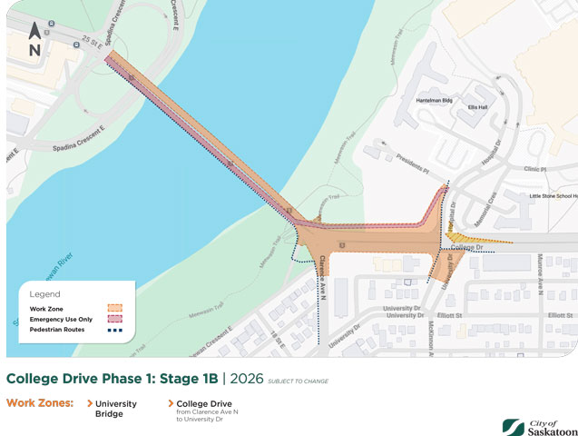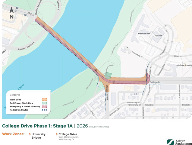 - Saskatoon Transit will be accommodated via the eastbound lanes of University Bridge and College Drive to the intersection of Hospital Drive for approximately 3 weeks.